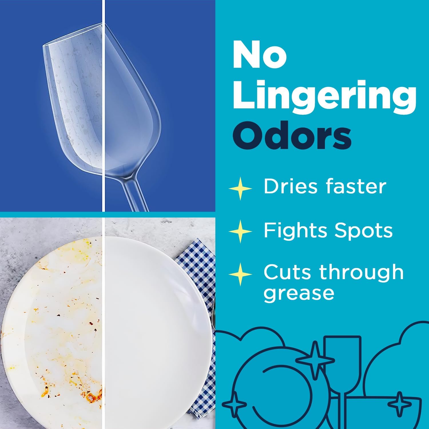 - Powerful Cleaning Performance: Our dishwasher detergent pods feature a powerful formula that effectively removes baked-on food, grease, and stains from plates, glasses, pans and cutlery without the need for pre-soaking; Every dish washing pod provides spot-free and squeaky clean dishes with every wash