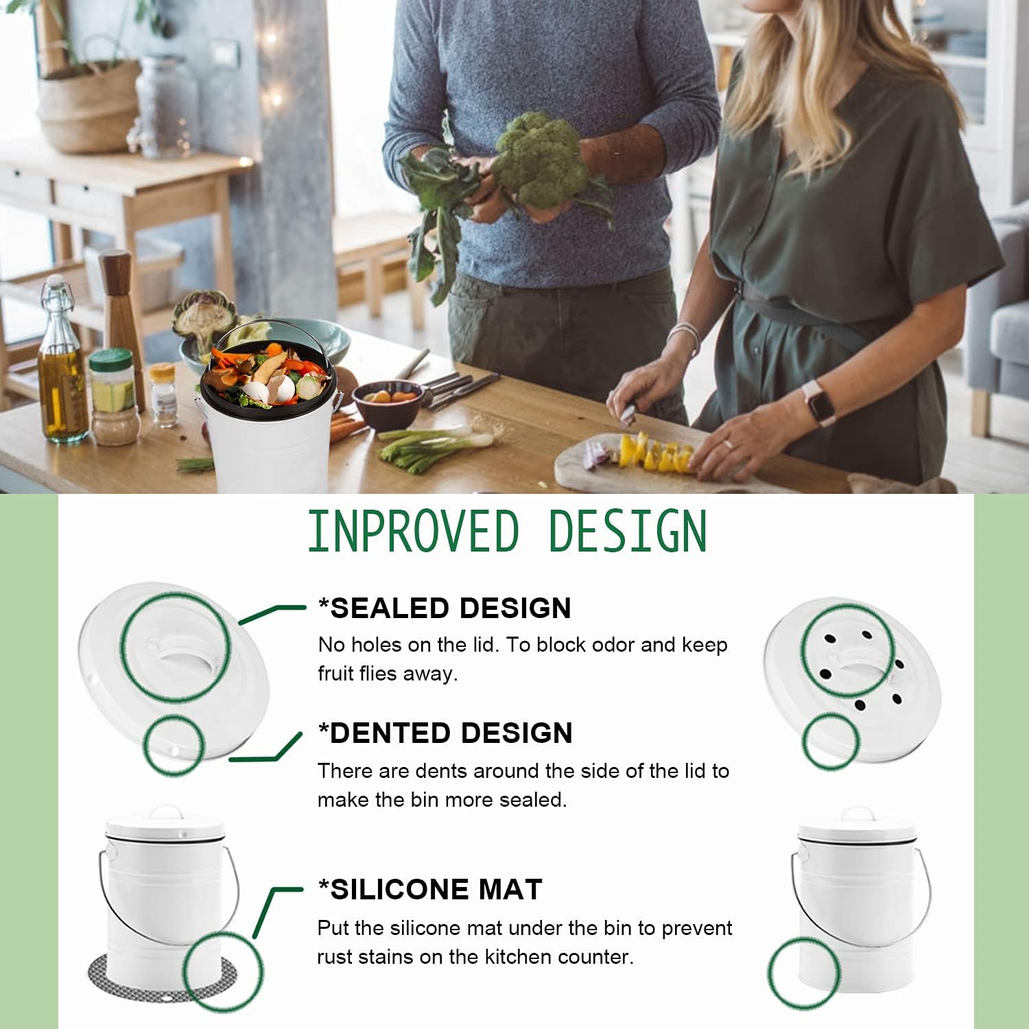 - Odor Blocking: Say goodbye to the smelly decomposing waste. Thanks to the improved sealing design of our composting bin and the charcoal filters that absorb odors inside, you can let the scraps build up for several days without worrying about attracting flies or terrible smells into your kitchen.