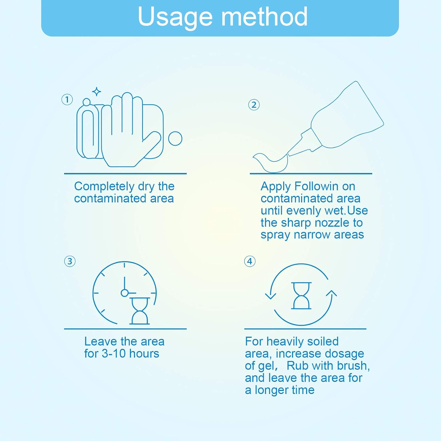 - Simple & Effortless Operation:Apply evenly—dry the surface,then directly apply the gel to the area affected by mold stain (switch to the included tip cap);Wait & Soak-let it sit for 3-10 hours (adjust according to mold stain severity) to allow active ingredients to fully clean mold stain;No Scrubbing Needed-no need for heavy scrubbing, sanding, or wire brushing. Mold stain is removed easily, saving time and effort.During this period, take care to prevent water from spraying onto the gel.For stubborn mold stains,repeat the above cleaning steps.
