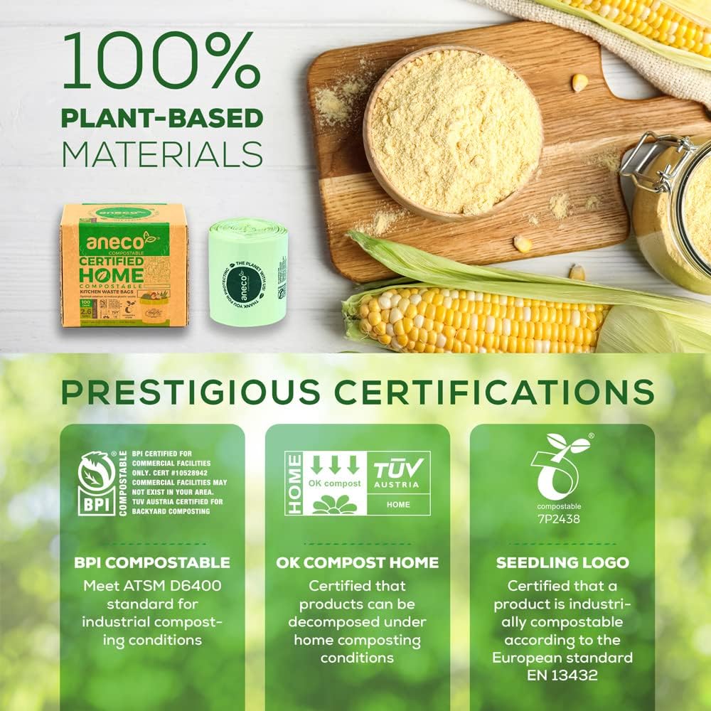 - π Proud to be one of few HOME compostable trash bags in the market, ANECO Compostable bag can break down completely not only in industrial facilities but also in home system. Use these bags to collect kitchen scraps and put them straight into the compost dumpster, or bury and turn them into valuable compost for your gardendecomposes fully into CO2, water and organic biomass after 6-12 months, leaving no traces of plastic in the environment.