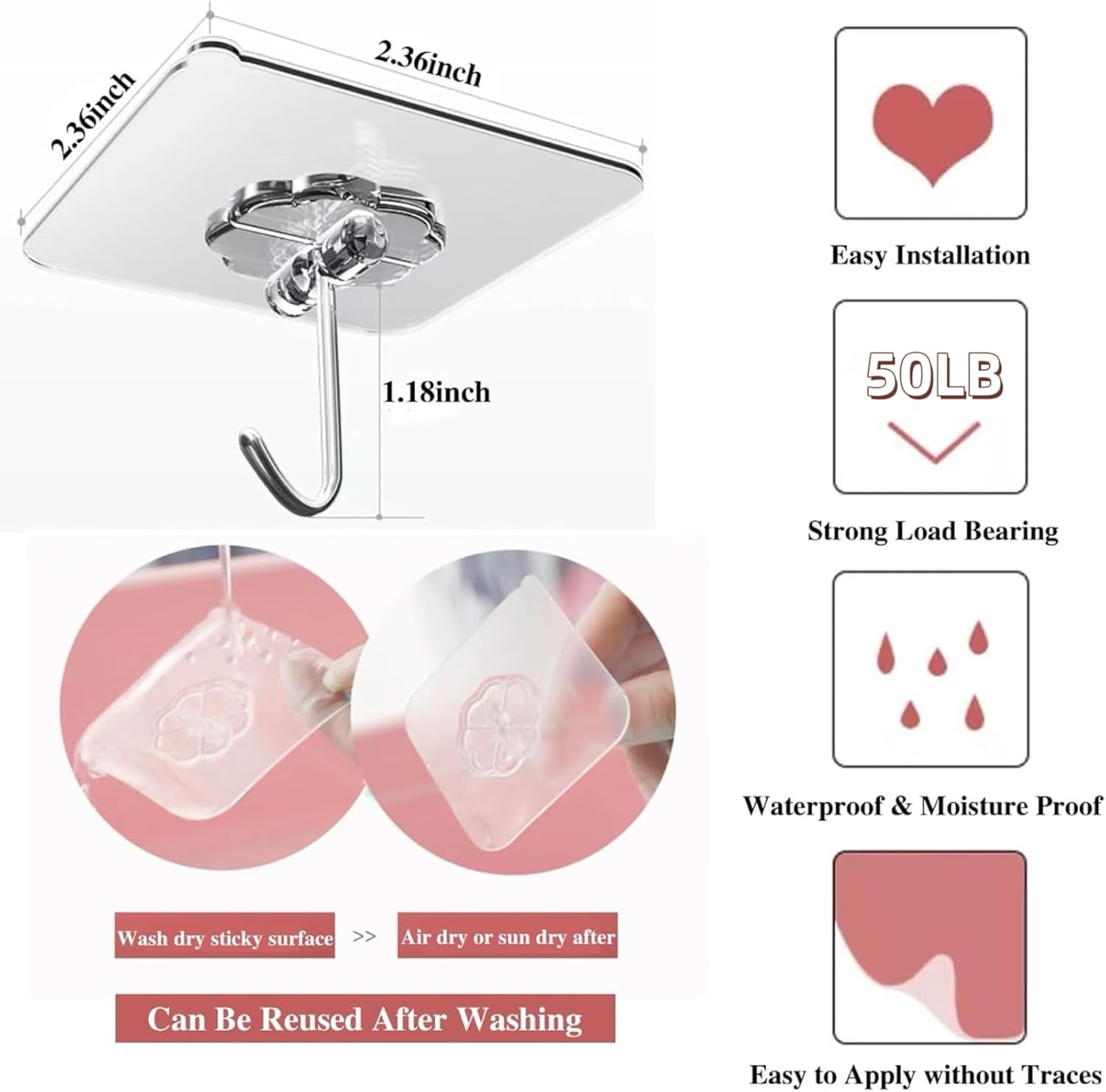 - EASY USE & QUICK INSTALLATION - No drilling, no screws, no nails and no glue, the utility wall hooks only just you peel off the cover starting from the bulge, then put the adhesive hooks on smooth surface like tile, glass, metal, wooden door, stainless steel (please note that there are restrictions on painted walls)
