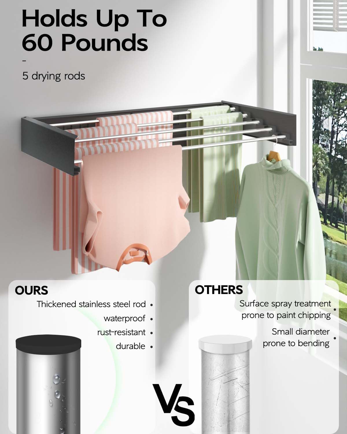 Wall Mounted Clothes Drying Rack 32", Foldable Wall Mount Laundry Rack Folding Indoor, Drying Rack Clothing Collapsible, Hidden Space Saver with Wall Template, 5 Rods, Black
