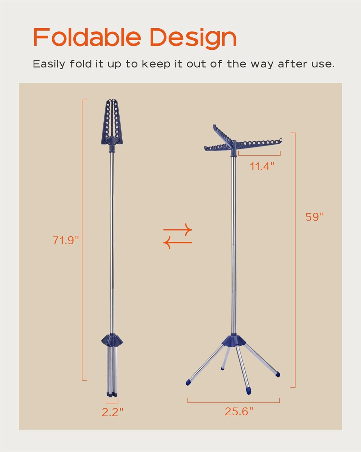 - [Foldable and Space-Saving] This vertical drying rack measures 25.6βD x 25.6βW x 59βH and takes up very little space. After use, simply fold the four legs and three drying rods into a smaller size: 2.2 "D x 2.2 "W x 71.H, which can be leaned against the footrest, perfect for apartment laundry rooms or narrow spaces and corners.