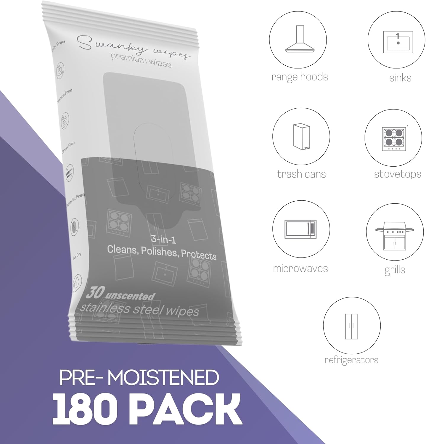 - PRODUCT SPECS - Swanky Stainless Steel Cleaning Wipes come in a pack of 180 soft, non-scratch wipes. Each wipe is pre-moistened and ready to use, making them a convenient addition to your cleaning supplies. Ideal for keeping your stainless steel appliances looking polished and clean.