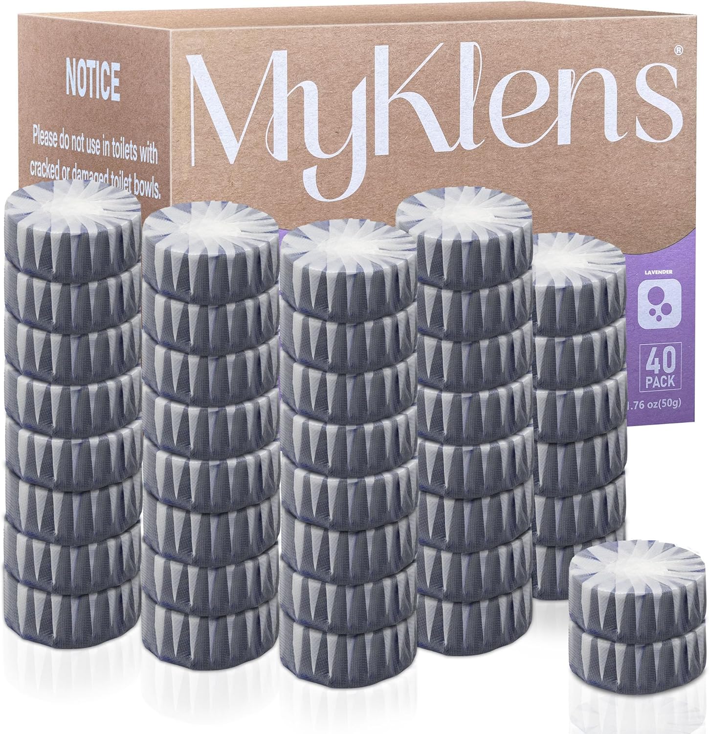 - Important Note: MyKlens toilet cleaner tablets can reduce the buildup of dirt in the toilet bowl, but are not replacement for toilet brush. Please clean the toilet bowl with a brush before the first time using our products. When the toilet bowl cleaner tablet dissolves completely and the BLUE/GREEN/PURPLE water turns transparent, please replace it with a new tablet.