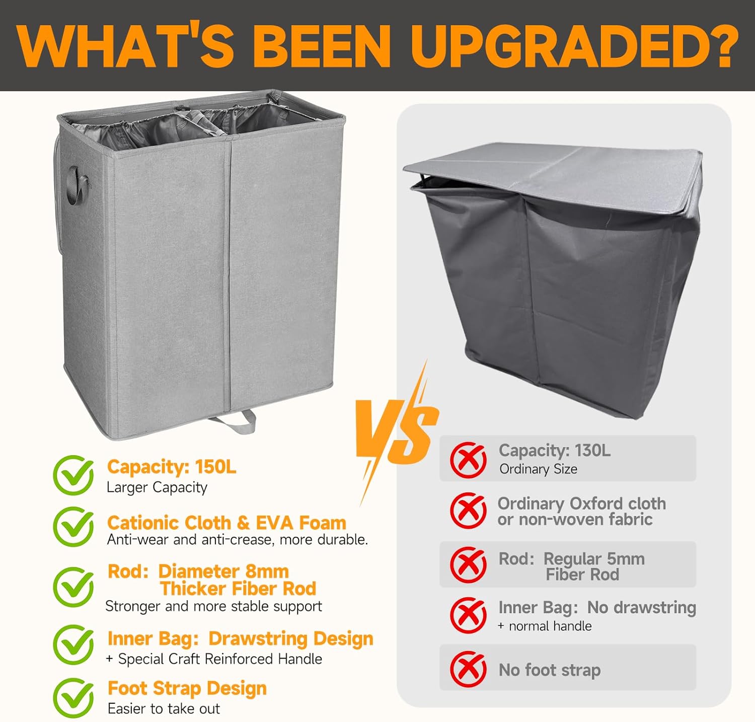 • 【Size Upgrade】The double compartment clothes basket measures 24x 13.4 x 28in with a huge capacity of 150L, which can hold 4 loads of laundry, and each compartment is 75L which can hold 2 loads of laundry individually