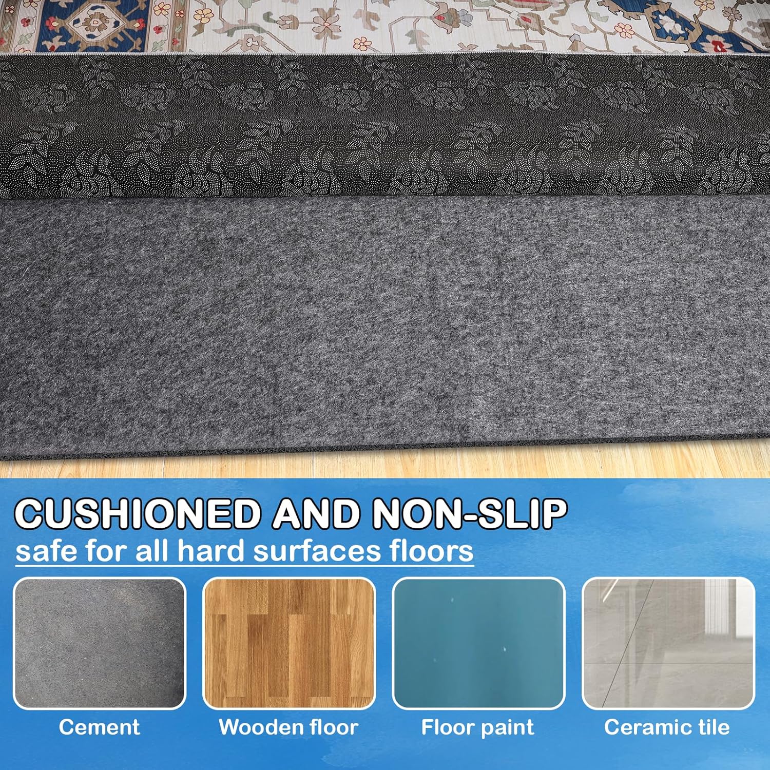 - 【 Waterproof Rug Pad】-- Thick felt + Waterproof TPR carpet pad for all types of carpeting. The rough fabric of the felt top layer grips the carpet tightly to prevent it from curling and crawling, while the non-slip backing prevents the carpet from slipping in any direction.