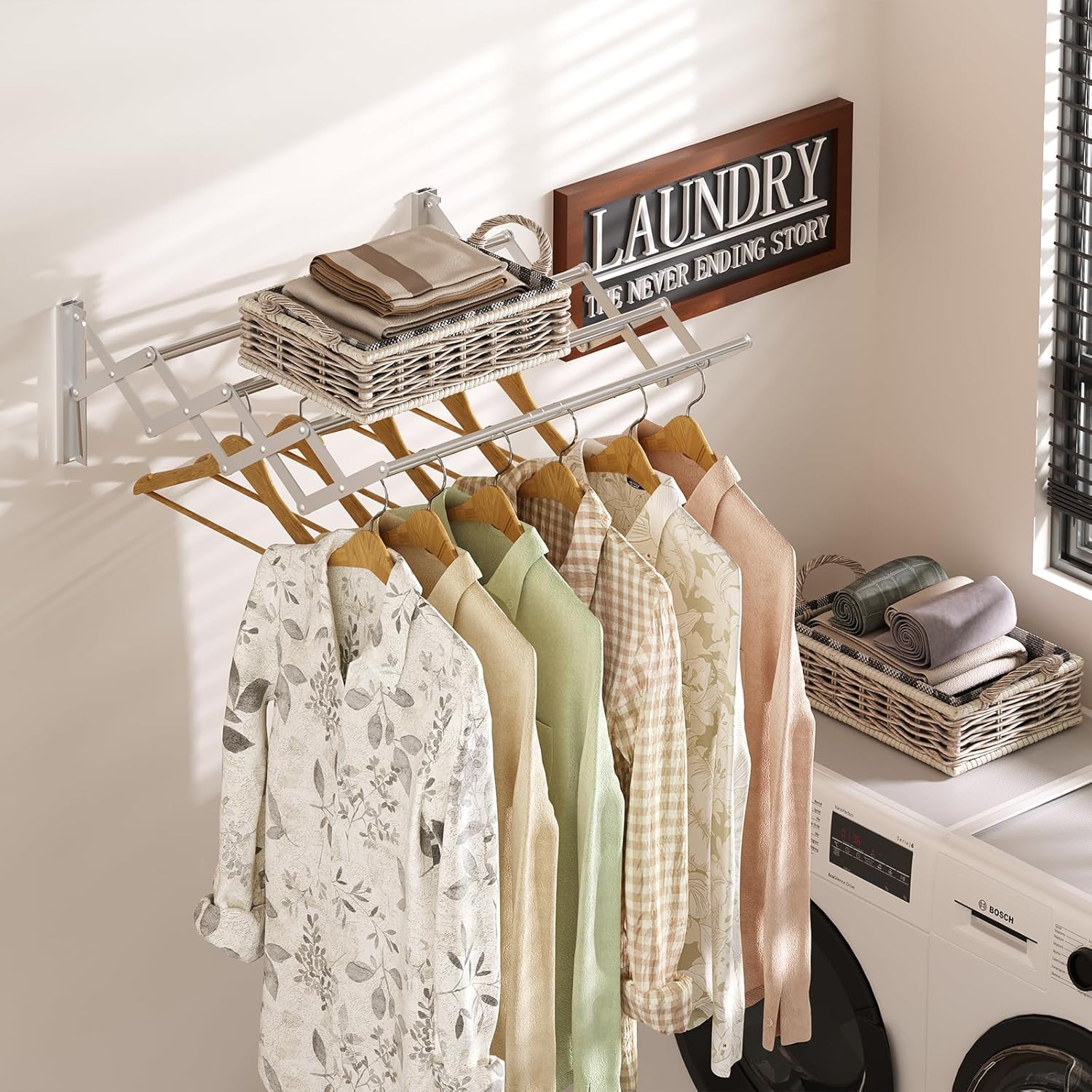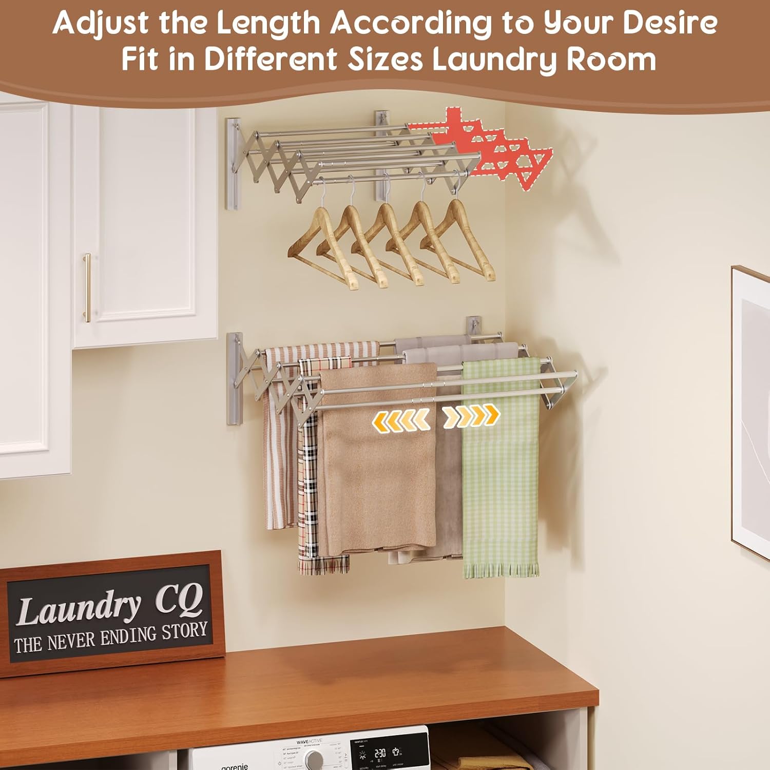 • Compact with Large Drying Space: Wall mounted and collapsible expandable design for max space helper, just expand when air drying; 8 rods 23 linear feet offers adequate hanging drying space.