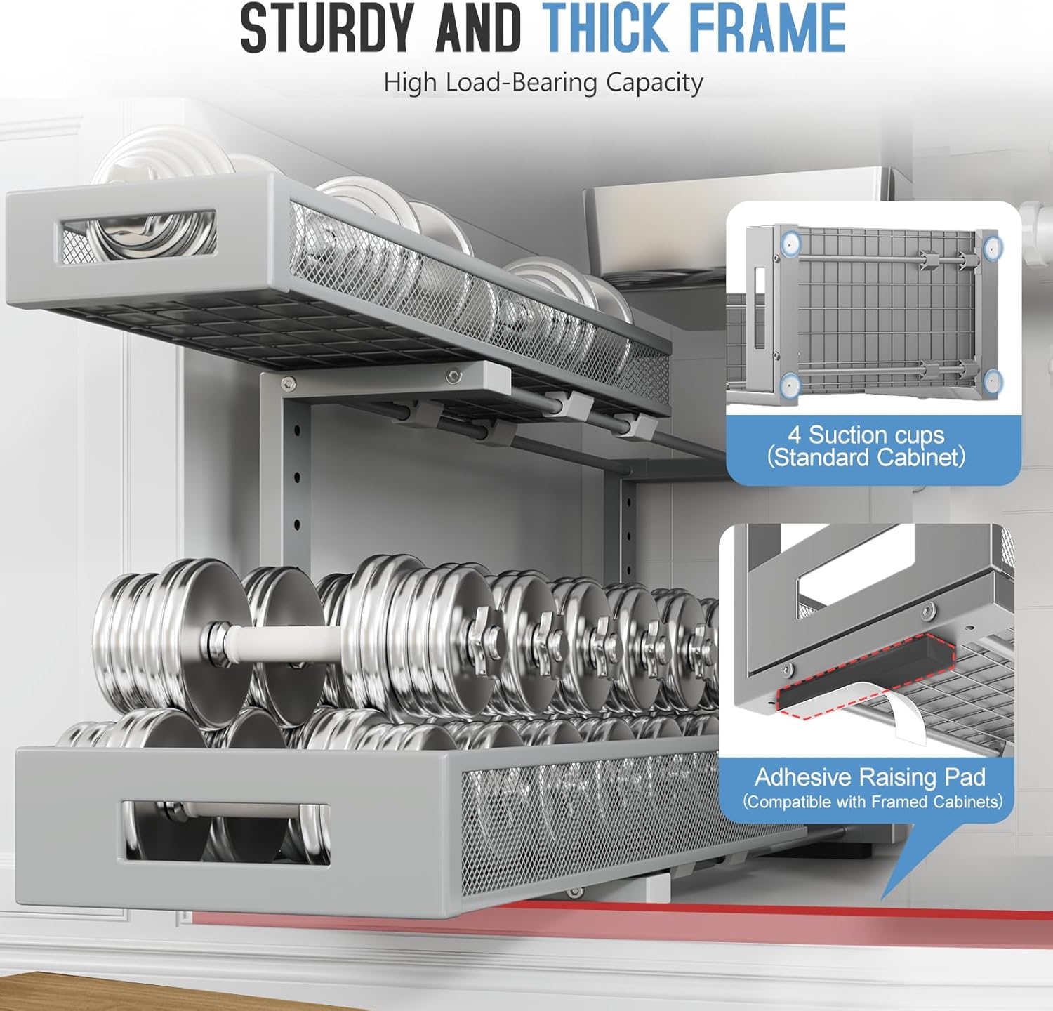 - ă2-Tier Pull-Out Design for Easy AccessăThis under-sink organizer features a double-layer pull-out design, allowing you to easily access items at the deepest part. The upgraded, thickened iron circular sliding rails ensure a smooth and seamless pulling experience, making each use effortless. The unique pull-out locking mechanism effectively prevents the drawers from being completely pulled out, avoiding the risk of items falling or structural damage caused by over-pulling, ensuring safer and more convenient use.