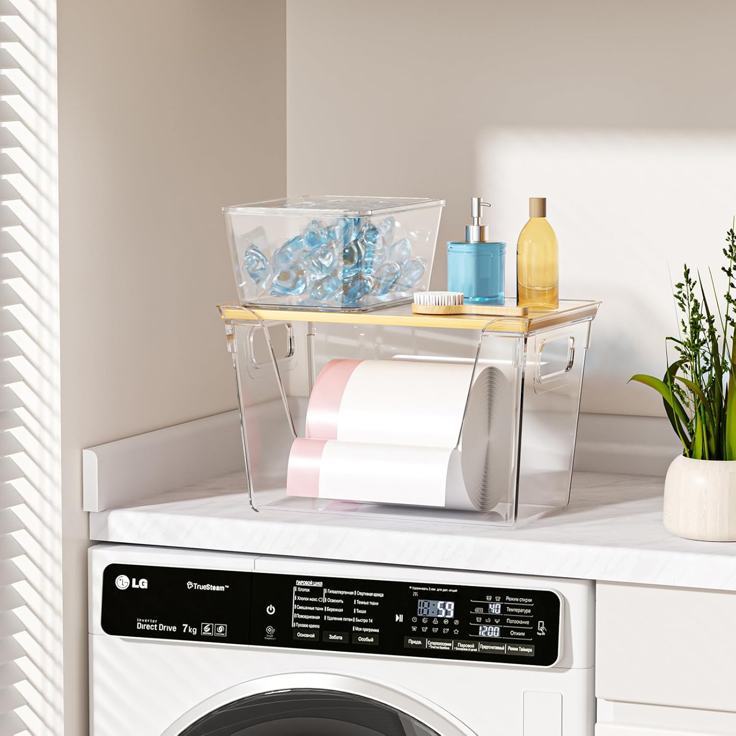 - Front Wide Opening Design: This laundry room organization storage bin features a spacious front opening, allowing direct access to the contents without needing to open the lid or move items stacked on top. The top of the trash bag holder dispenser has a bamboo lid that can also be used to place items on, with a load-bearing capacity of 12 kilograms, making organization easier