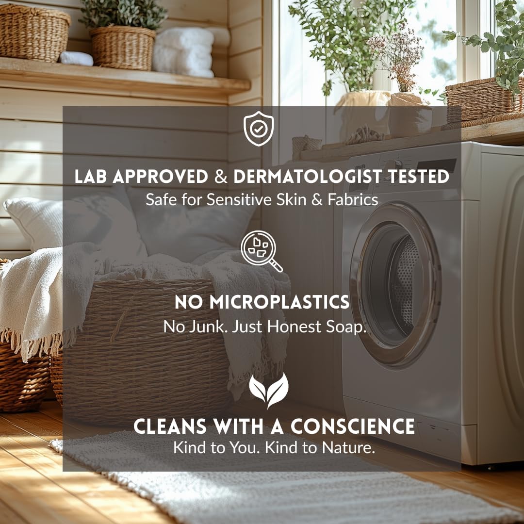 - ✔ HYPOALLERGENIC & GENTLE ON SKIN Made with hypoallergenic ground bar soap and no harsh chemicals — safe for sensitive skin and delicate fabrics.