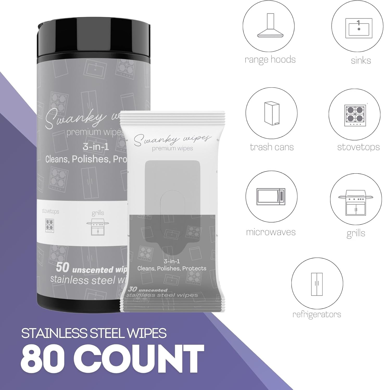- PRODUCT SPECS β Swanky Stainless Steel Cleaning Wipes come in a bundle with Soft Wipes (30 Count) & Canister (50 Count). Each wipe is pre-moistened and ready to use, making them a convenient addition to your cleaning supplies. Ideal for keeping your stainless steel appliances looking polished and clean.