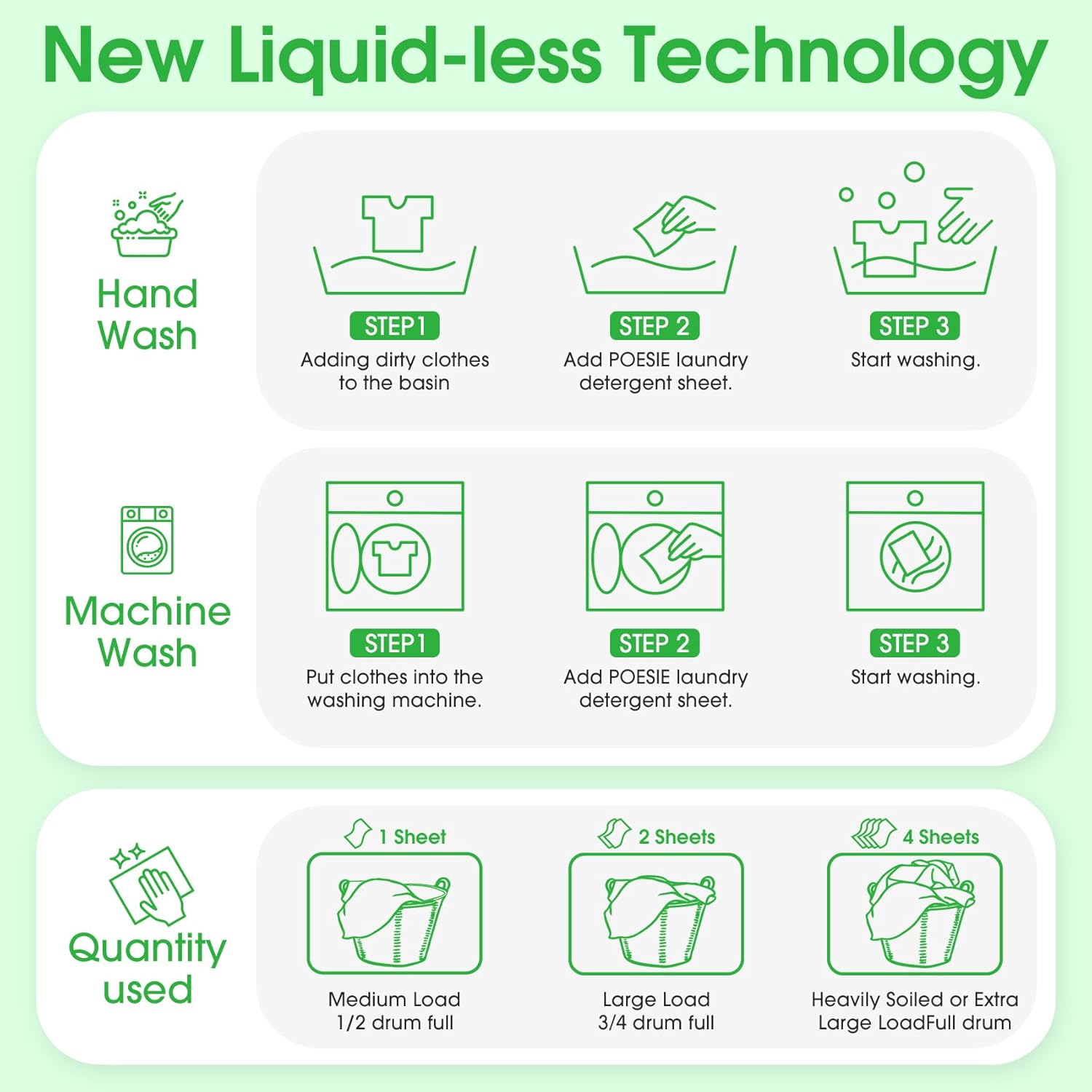 - Easy to Use - Liquidless detergent sheets, 1 sheet for small or medium loads where clothes are not very dirty, 2 sheets for large loads and 4 sheets for extra large loads, no waste. Not too little and not too much to save resources