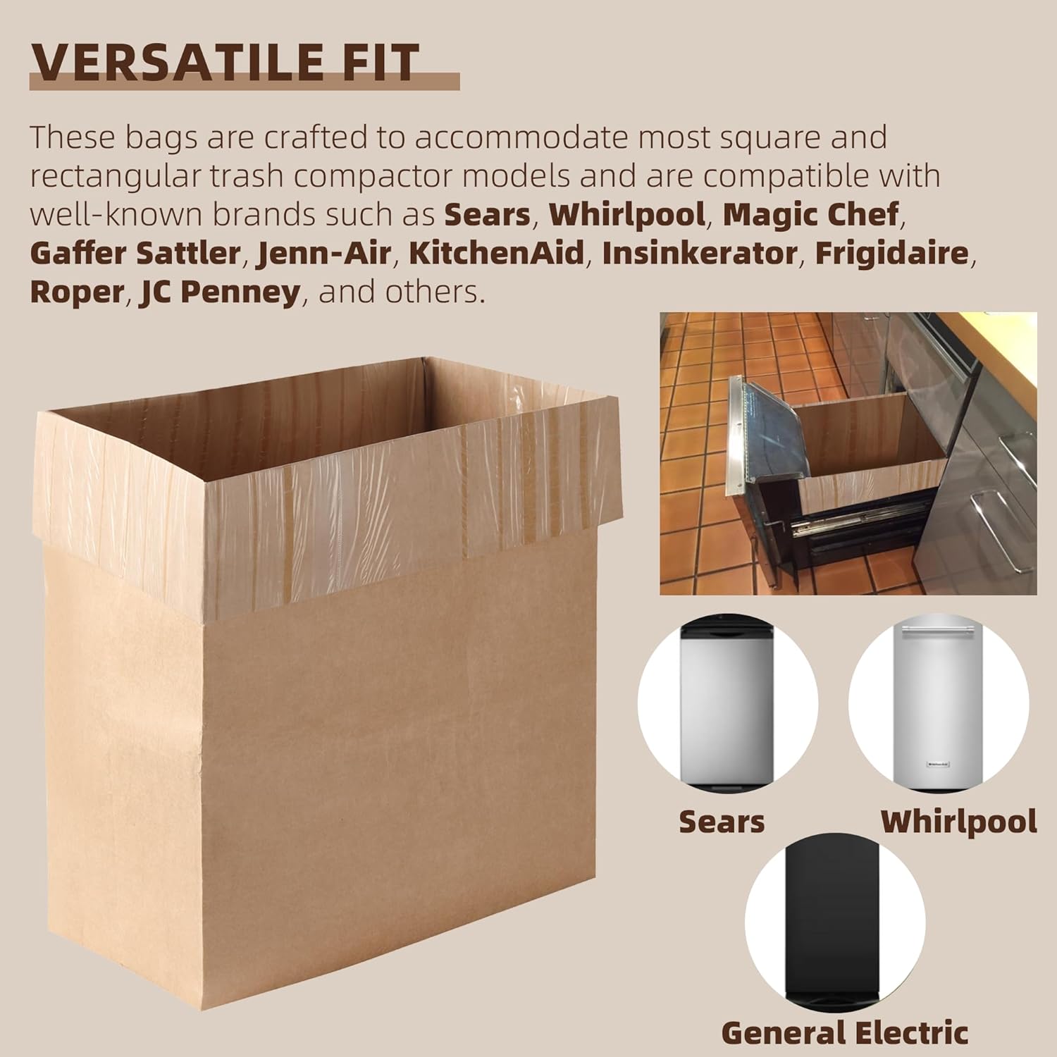 - Just the Right Fit: These compactor bags are crafted to accommodate most square and rectangular trash compactor models and are compatible with well-known brands such as Sears, Whirlpool, Magic Chef, Gaffer Sattler, Jenn-Air, KitchenAid, Insinkerator, Frigidaire, Roper, JC Penney, and others