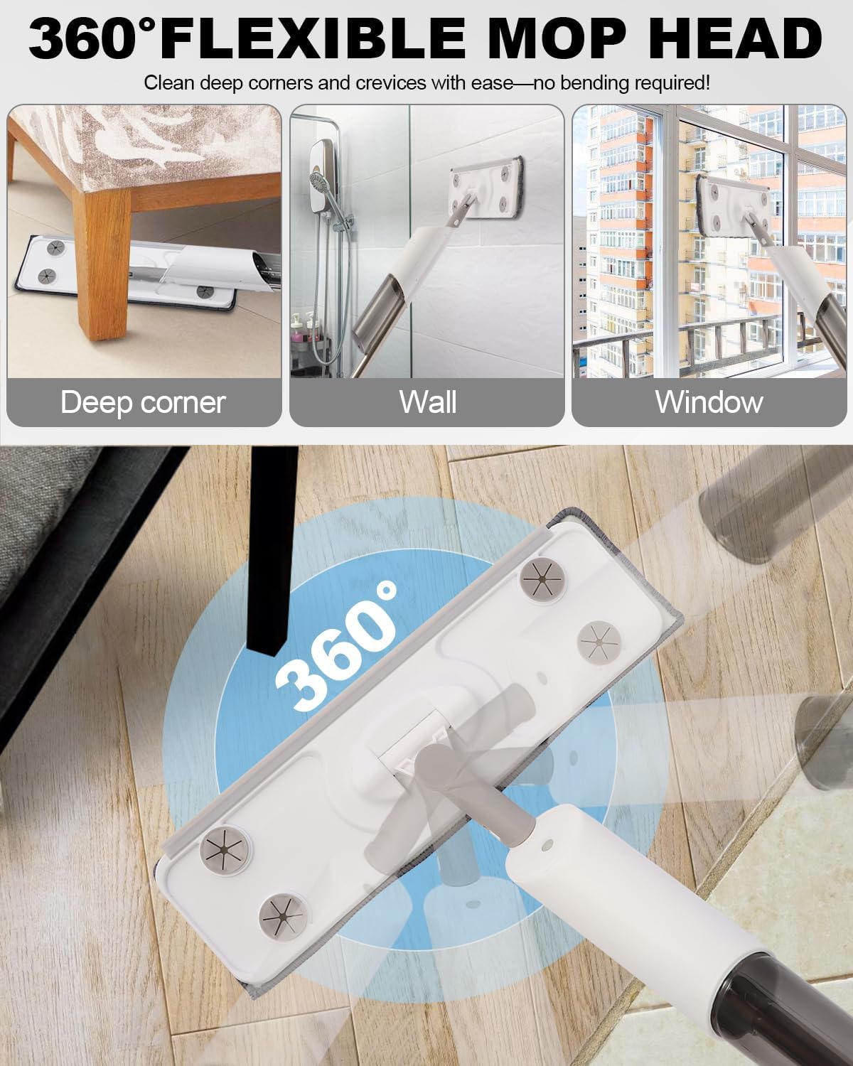 • 【360° rotation of the mop head, suitable for various scenes】Small size mop head, all kinds of details can be taken care of.360° flexible rotation of the mop head, no need to bend, easy to go into the bottom of the furniture, such as under the sofa, under the bed.And light weight, lift up not laborious, can be used to clean walls and Windows not tired hands.