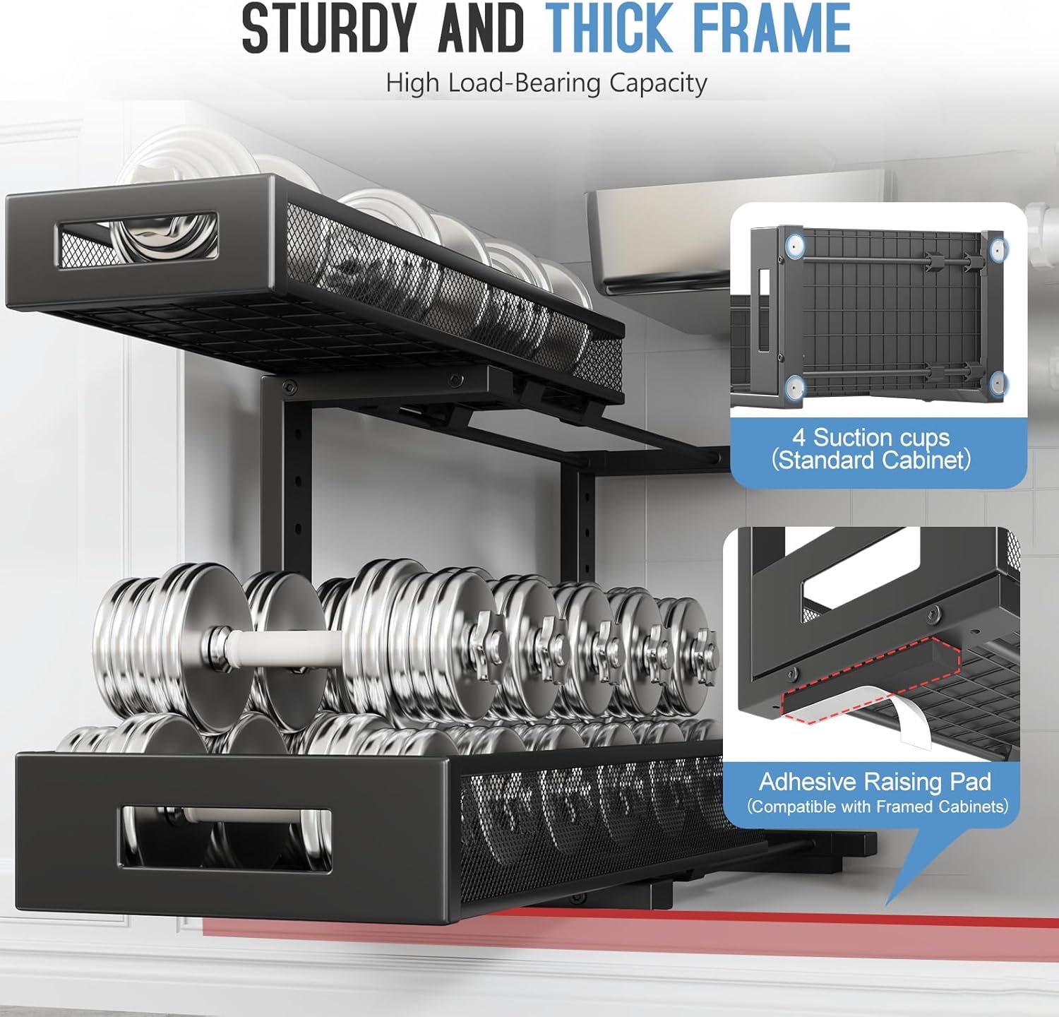 - 【2-Tier Pull-Out Design for Easy Access】This under-sink organizer features a double-layer pull-out design, allowing you to easily access items at the deepest part. The upgraded, thickened iron circular sliding rails ensure a smooth and seamless pulling experience, making each use effortless. The unique pull-out locking mechanism effectively prevents the drawers from being completely pulled out, avoiding the risk of items falling or structural damage caused by over-pulling, ensuring safer.