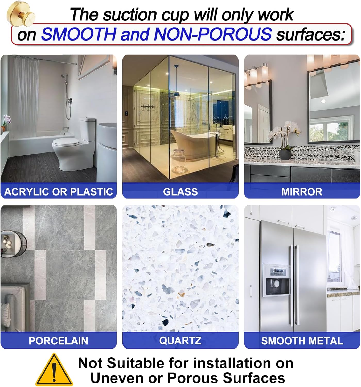 - [Application Surfaces]: These suction cup hooks are suitable for Glass, Mirrors, Glossy porcelain tiles, Acrylic, Plastic, Smooth stainless steel, Quartz, Laminate, and other smooth and non-porous surfaces