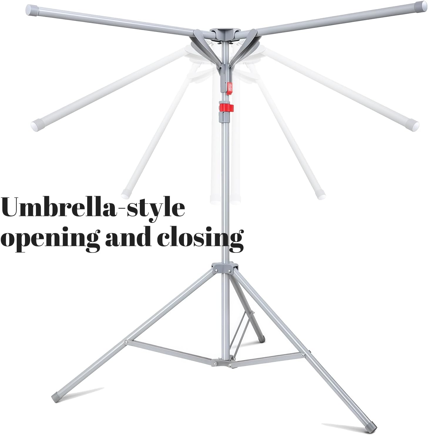 • Sturdy& Durable: space-saving drying clothes rack has four arms that can hold up to 154lbs garments. You can expand the number of arms you need according to the space and usage needs.The unique tripod structure of the collapsible drying rack can maintain perfect stability in a limited space.